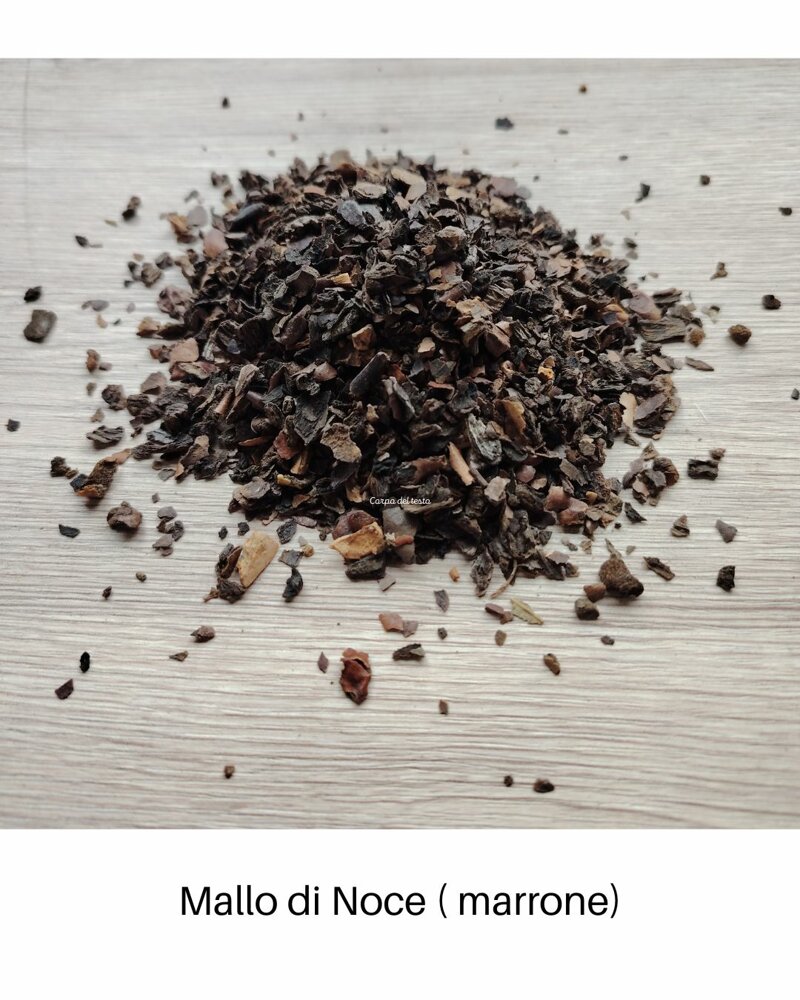 Il mallo è la parte di frutto verde che si raccoglie a giugno, prima della formazione della noce. L'abbiamo raccolta, spezzettata e essiccata al sole.